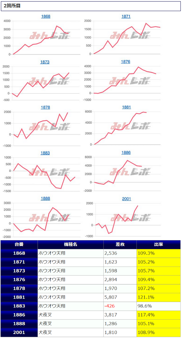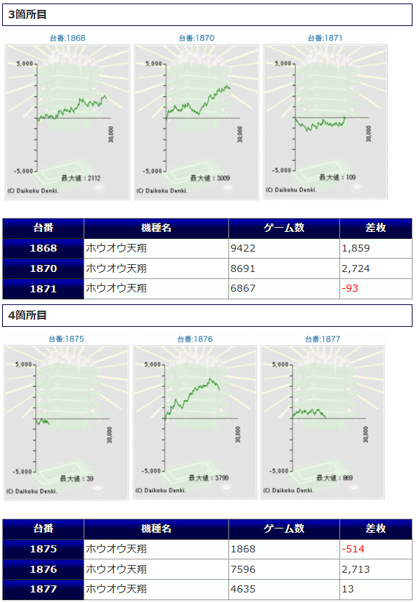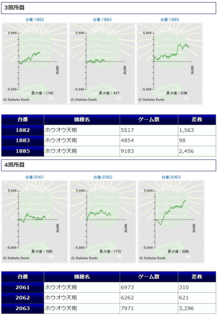 5箇所、15台の仕掛けとなった「鳳凰天翔」は、+2,724枚、+2,713枚といった纏まった出玉が幾つか獲得されたものの、伸び悩んだ台が少なくなく、1台平均+416枚、出率102.5%と控え目な結果に終わっています。