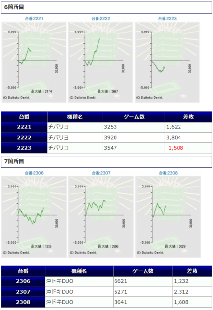 沖スロコーナーを中心とした仕掛けで「チバリヨ」から+4,132枚、+3,615枚「沖ドキDUO」から+1,987枚、+1,780枚といった出玉が見られていました。