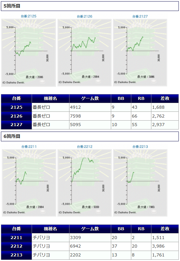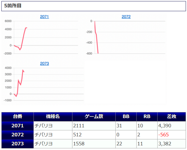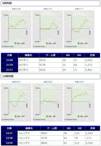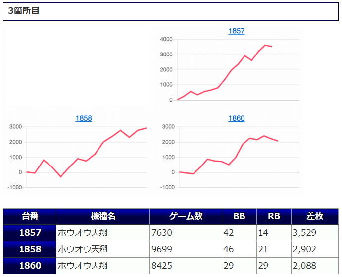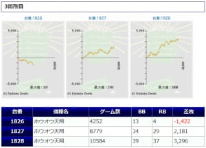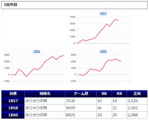 3台並んでプラスになっている箇所も存在しますし、差枚数値、出率、勝率、いずれも好結果に纏まっていますので、まずまず良好な仕上がりなのではないでしょうか。