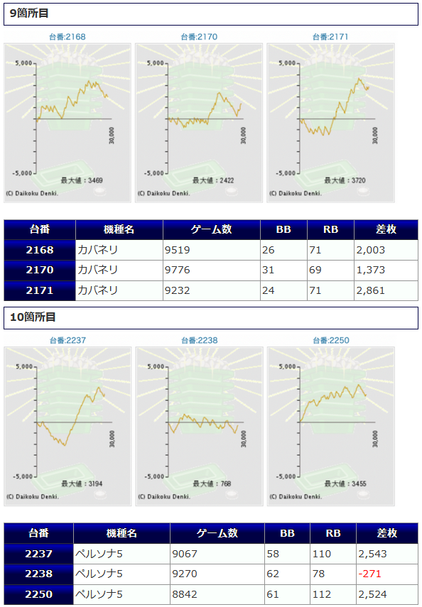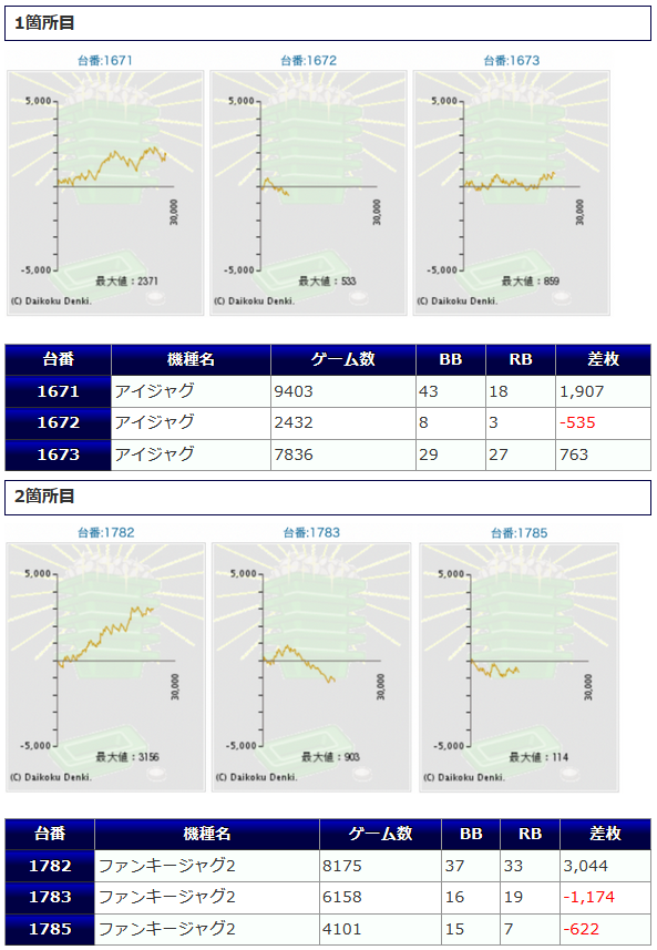①箇所目「Sアイム」②箇所目「ファンキー2」どちらも1台は好結果が見られていますが、他2台が展開悪くマイナスとなってしまったり、伸び悩んで小ぶりな差枚獲得となっています。
