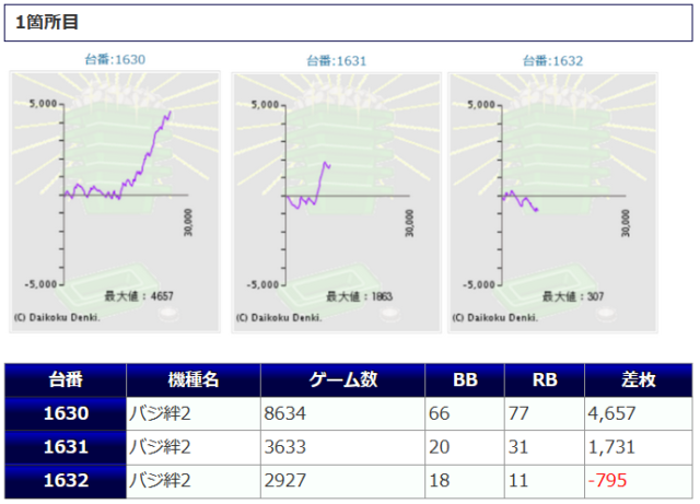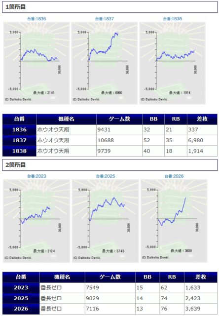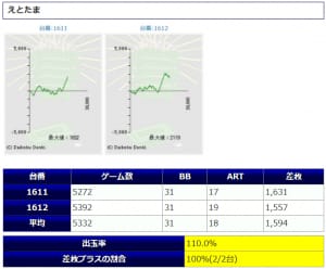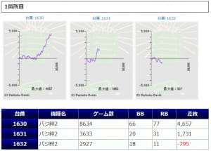 平均稼働はマッピー7,083G、うしおととら6,704Gと高稼働で、差枚もマッピーは2台共に+2,000枚以上、うしおととら+1,335枚、+1,955枚となっており、優秀な結果を収めています。