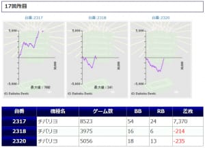 出玉に関してはチバリヨから+6,121枚、+4,865枚、+4,862枚、番長ZERO+7,771枚、+7,300枚、+4,145枚、鳳凰天翔+5,052枚、+4,058枚、+4,046枚と、チバリヨ・番長ZERO・鳳凰天翔が目立つ結果となりました。
