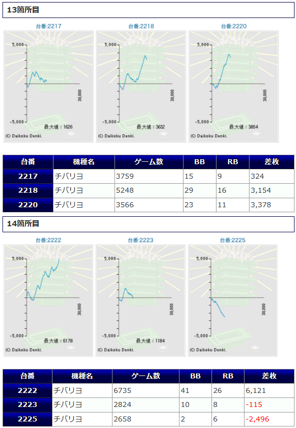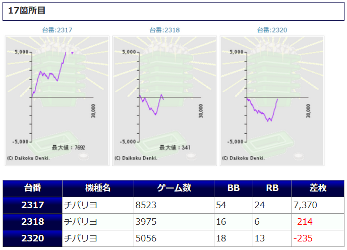 「チバリヨ」中心の構成でしたが、そのチバリヨから+7,370枚、+6,560枚、+5,820枚といった尖った差枚の台が複数現れ、盛り上がりを演出していました。