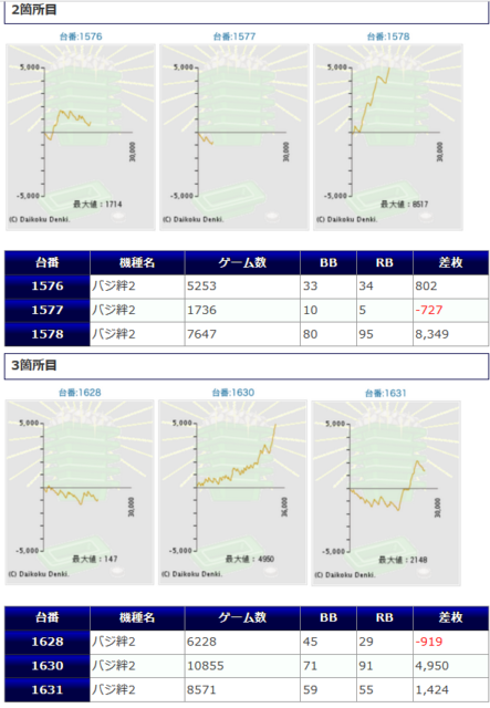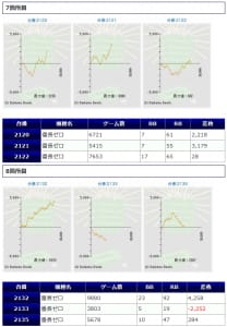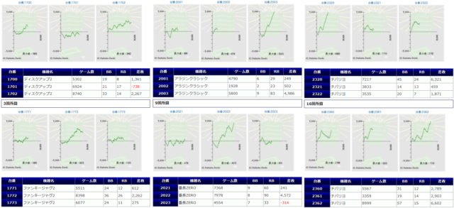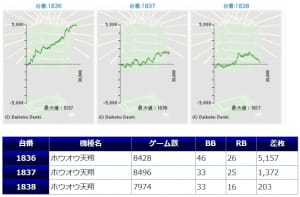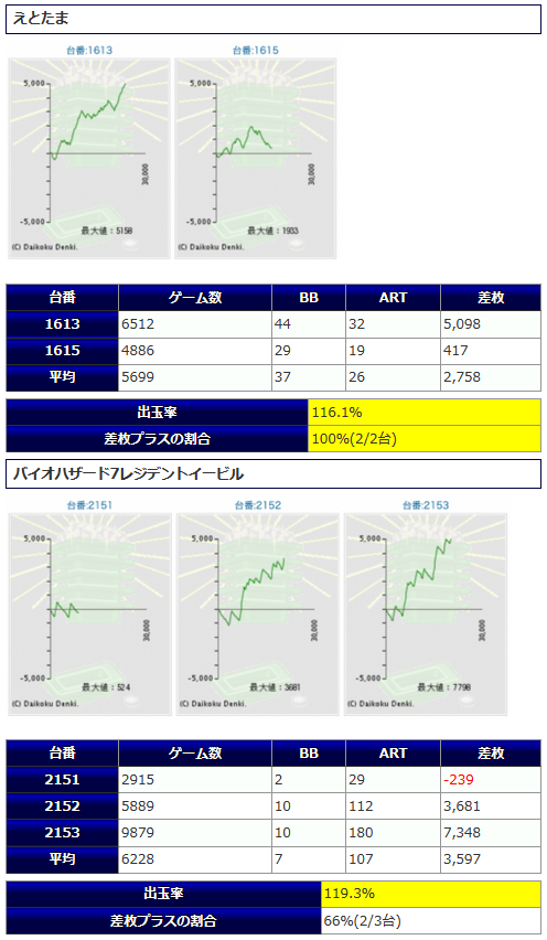 ギアス3から+3,603枚、バイオ7から+3,822枚と纏まった差枚も確認され、打ち込み平均もギアス3は5912G、バイオ7は8597Gと深く