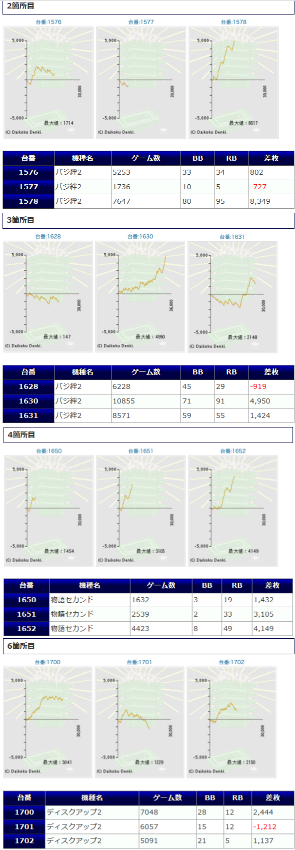 一方の半数からは、定番人気AT機種中心の構成で「アラジンクラシック」から+4,986枚、「番長ZERO」から+4,572枚、「ディスク2」から+2,267枚、「ファンキー2」から+2,262枚等、各々からしっかり魅せてくれました。