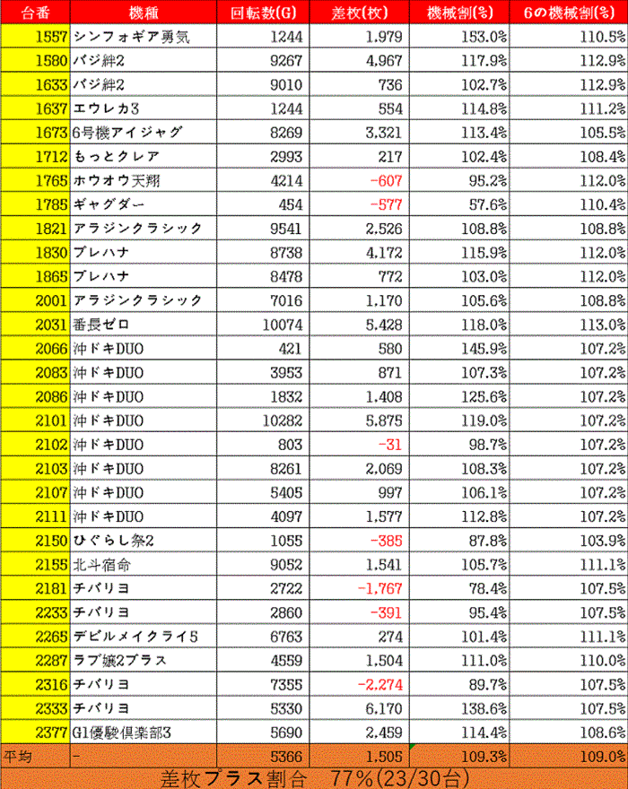差枚プラスの割合 77%(23/30台)