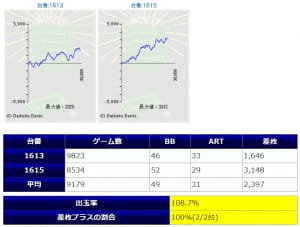 今回の「マキシマムスロッター」でしたが、至る所で大量出玉を確認出来て、全体での結果は、平均差枚+1,505枚、出玉率109.3%と設定6平均PAYOUT109.0%の近似値に落ち着きました。