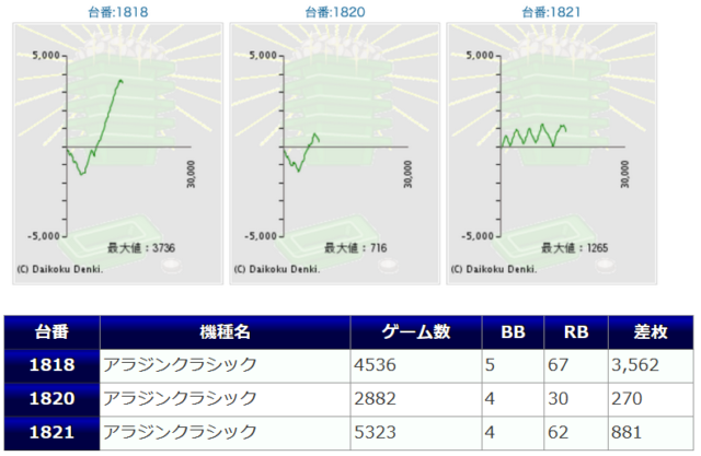 4箇所の沖ドキDUOと4箇所のチバリヨ、アラジンクラシック2箇所に番長ゼロといったラインナップで、こちらのホール定番といった内容になってしまいました。