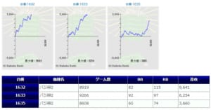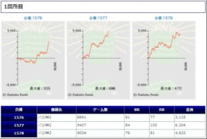 並び系全体でも平均6903G、差枚+2,960枚、出率114.3%と前日に引き続き、≪最上級≫の内容だったことは間違いないでしょう。今回は特に「絆2」の出玉がかなり安定していましたので、↓にスランプグラフを貼っておきます。同店は「わかりやすい仕掛け」を継続していますので、引き続き期待していきたいと思います。