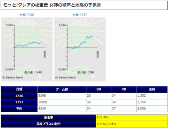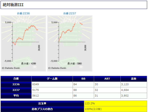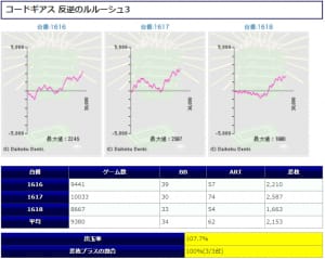 「絶対衝撃3」では残念ながら手ごたえを感じつつもマイナスとなってしまったようですが、対照的に「ギアスR2」平均ゲーム数8444G、平均差枚+3,389枚、出玉率 113.4%と「しっかり⑥」が使われていた素晴らしい内容だったと思います。