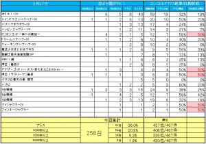 並ばせ屋山本の順位はサンプルが少ないですが4位/8件中、イベント全般の順位は54位/82件中となりました。プラスの台、1000枚以上の台、3000枚以上の台、どれも良くなかったですが、特に5000枚以上の台は2.6%で70位と悪かったです。高純増のAT機や機械割の高い台に高設定はほとんどなかったかもしれません。