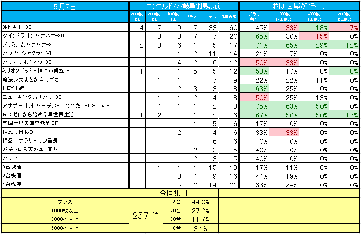 30/57台がプラスで、勝率は53%と高く、3000枚オーバーも10台もありました。
