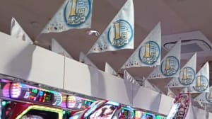 【設備評価】データ機器はパチ、スロ基本共通のカラフル7セグ系、台間シャッターは無いが、1パチと4パチの境界線に台間シャッター的なものは確認できた、肘掛けはないが、パチンコハンドルの手首掛けはあった、Wi-Fiは速度良し、USB無し、休憩所はソファとテーブル2つ、食堂は多分ないか不明、装飾はシンプルで1パチはコーナーごとにライト、ミドルと上側にあるフラッグで分かれていた