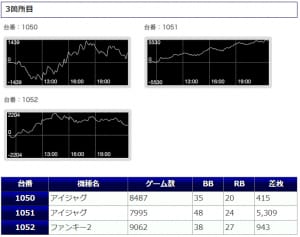 他は若干大人しかった印象ですが、3台並んでプラス着地となっているところも複数見受けられますし、ある程度の稼働が付いた台は概ねプラスへと繋がっていますので、仕掛けの片鱗が感じられる印象です。