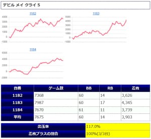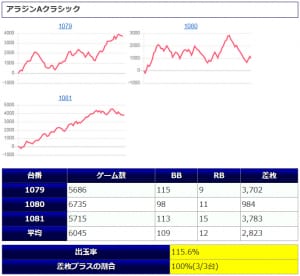並び系全体の結果は【平均差枚+887枚、平均出率108.5%、差枚プラスの割合66%(6/9台)】と、なっています。