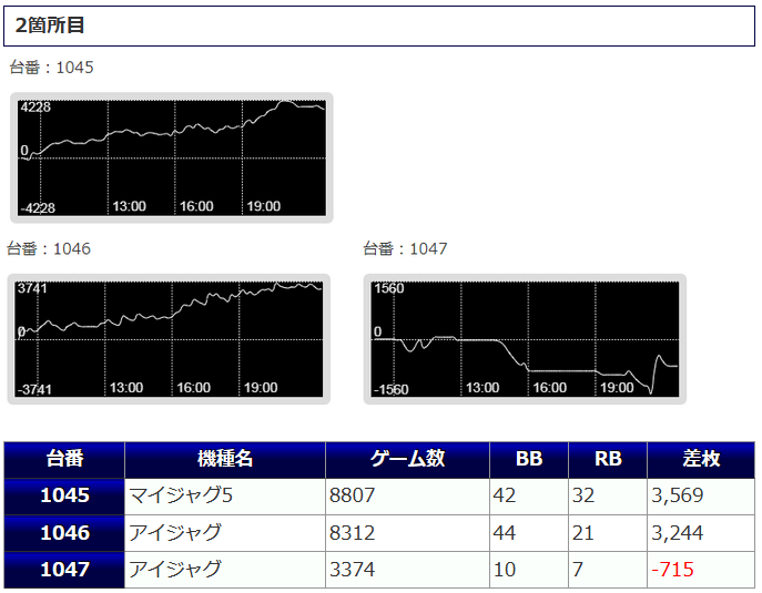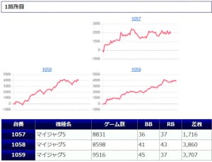 ②箇所目はジャグラーの機種跨ぎとなっており、若干難しい仕掛けだったように見受けられますが、「マイ5」と「Sアイム」の1台は並んで+3,000枚オーバーの獲得がされています。