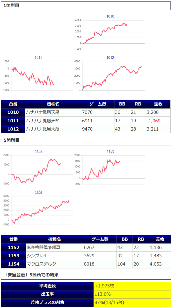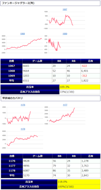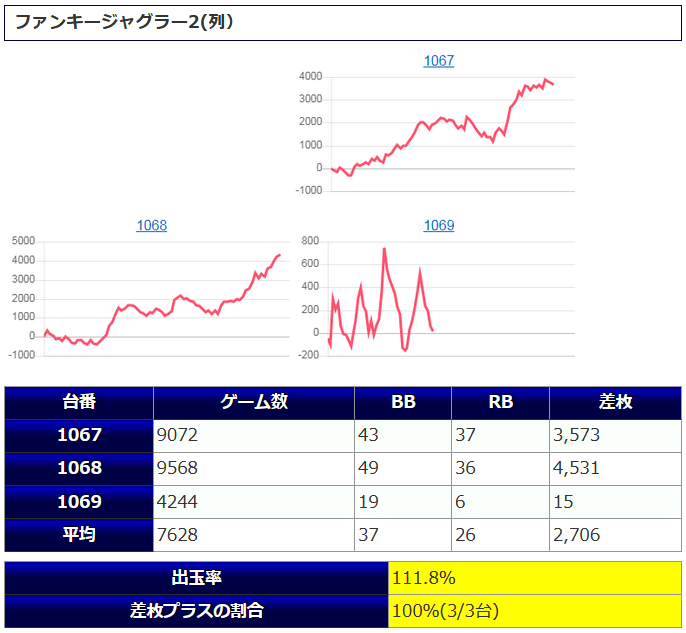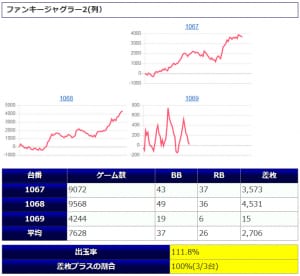 ①箇所目「マイ5」3台中、3台がプラスで、平均稼働は8,981G。総ボーナス合算1/112、総REG確率1/230、1台平均+3,094枚と、全台系の「ファンキー2(列)」を上回る仕上がりとなっています。