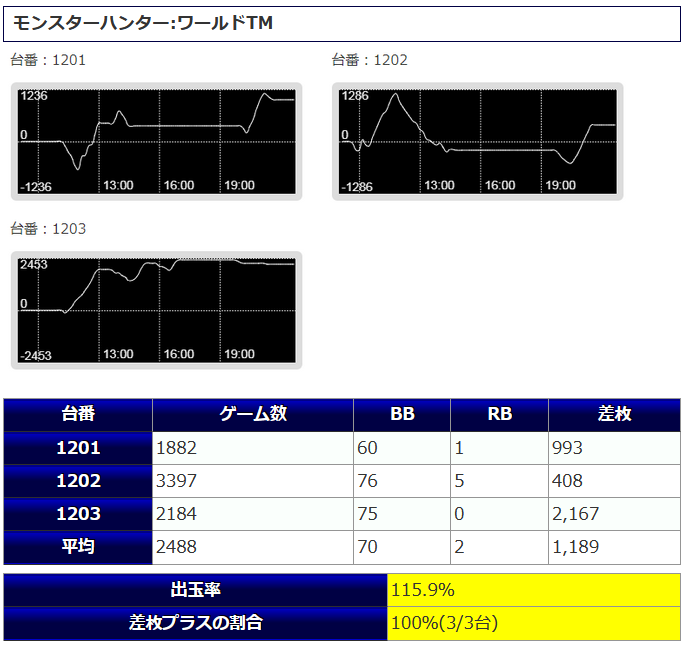 「モンハンワールド」は3台中、3台がプラス着地に成功し、内1台から+2,167枚の差枚が獲得されています。
