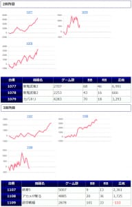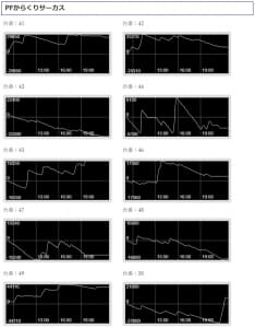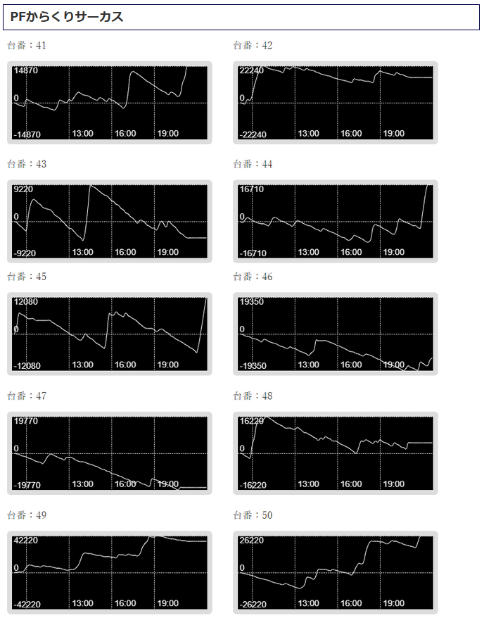 どちらの機種も甲乙つけがたい優秀な結果になっていますが、差玉数で言うならば「からくりサーカス」が優秀でしたね。+56,660発を筆頭に10台中、半数以上となる6台がプラス差玉となり、トータル差玉は+96,480発!1台平均+9,648発となっています。