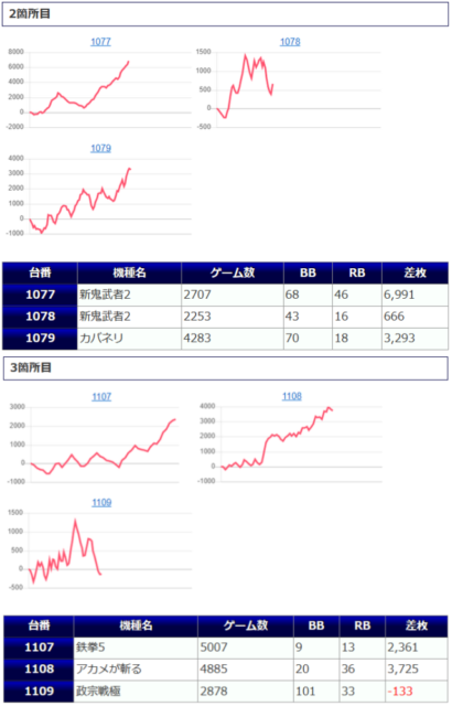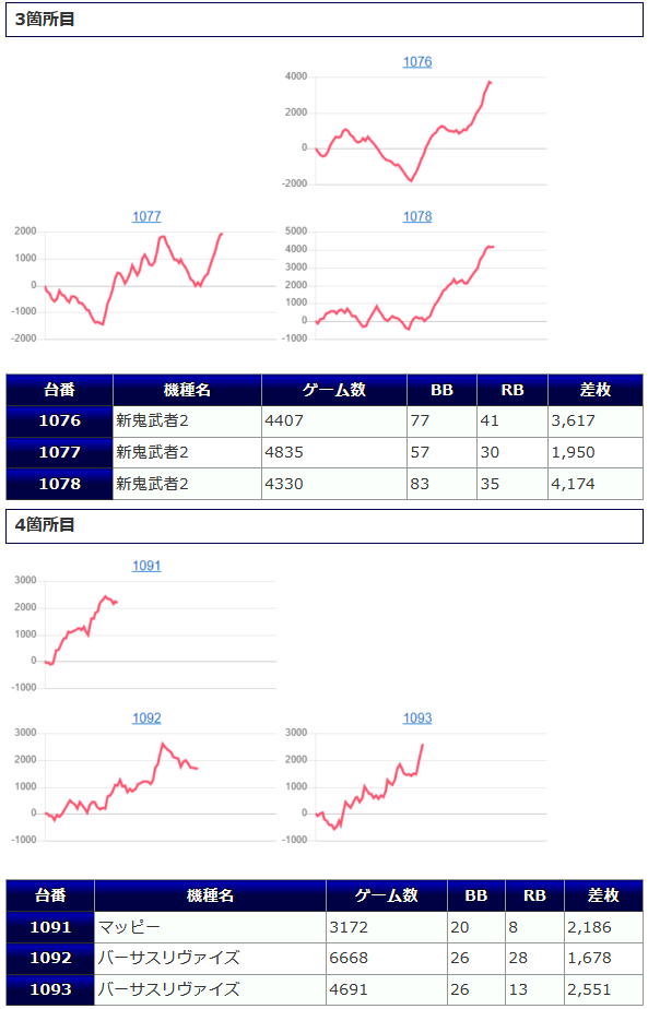 結果は優秀なものに仕上がっていますが、稼働量とスランプグラフを見る感じですと長く空き台になっていた時間があったように見受けられる台も存在していますので、仕掛けとして察知されていたようには見えませんね。