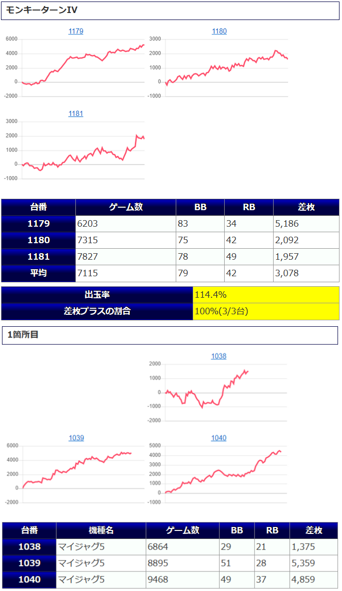 並び系全体の結果は【平均差枚+1,458枚、平均出率108.9%、差枚プラスの割合78%(7/9台)】と、なっています。