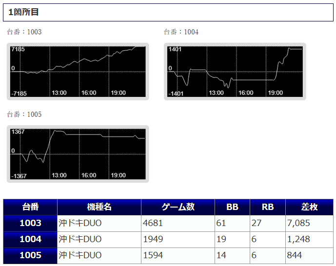 沖ドキDUO+7,085枚、ツインパ+4,398枚、アカメが斬る+3,774枚、ファンキー2+2,995枚、マイ5+2,995枚と、各箇所から大きな差枚が確認され、見せ場を作っていました。
