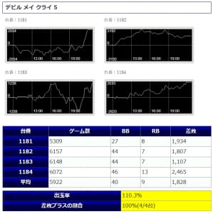 中でも目を引くのはDMC5ですね。平均稼働5922G、平均差枚+1,828枚、出率110.3%、勝率100%と見事な仕上がりとなりました。
