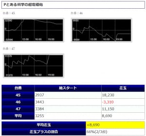 「とあるレールガン」から+25,040発、「ガンダムUC」から+21,270発と、大きな差玉も飛び出しトータルでプラス差玉と良好な結果になりました。
