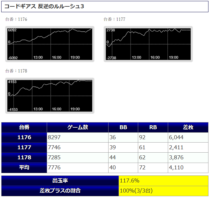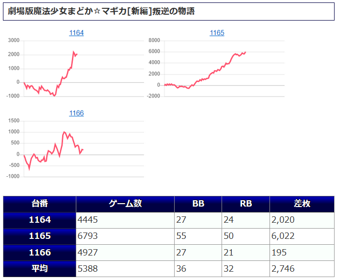 特にまどか叛逆は+2,020枚、+6,022枚、+195枚と全台プラスの完全勝利となっており出率も117.0%と素晴らしい結果となっています。