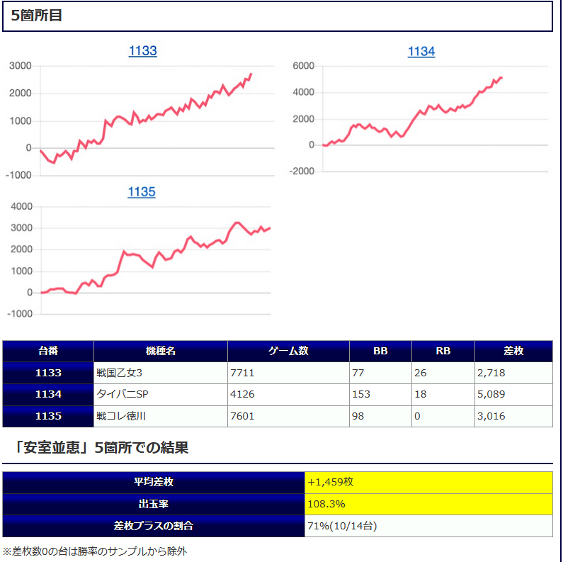 平均差枚+1,459枚、平均出率108.3%、差枚プラスの割合71%(10/14台)と中々に素晴らしい結果であった。