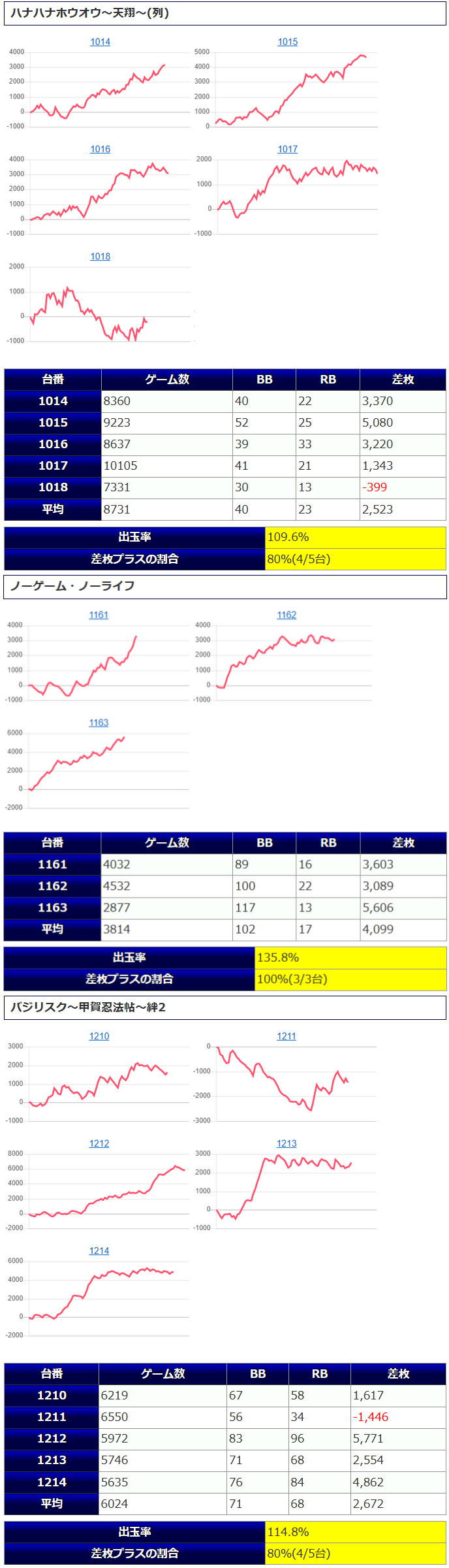 「バカボン」においては1台を除き全台が差玉万発を超える優秀な結果となった。