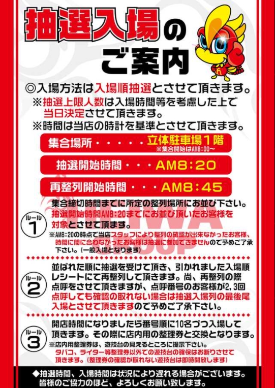 | 注意点 | 5の日のみ8時20分より抽選開始です。 |