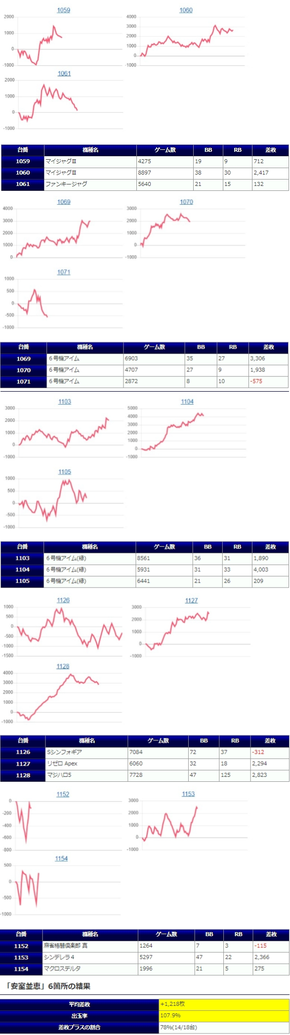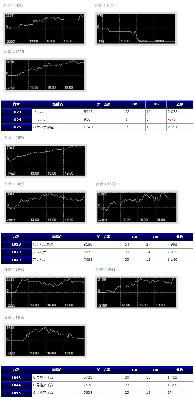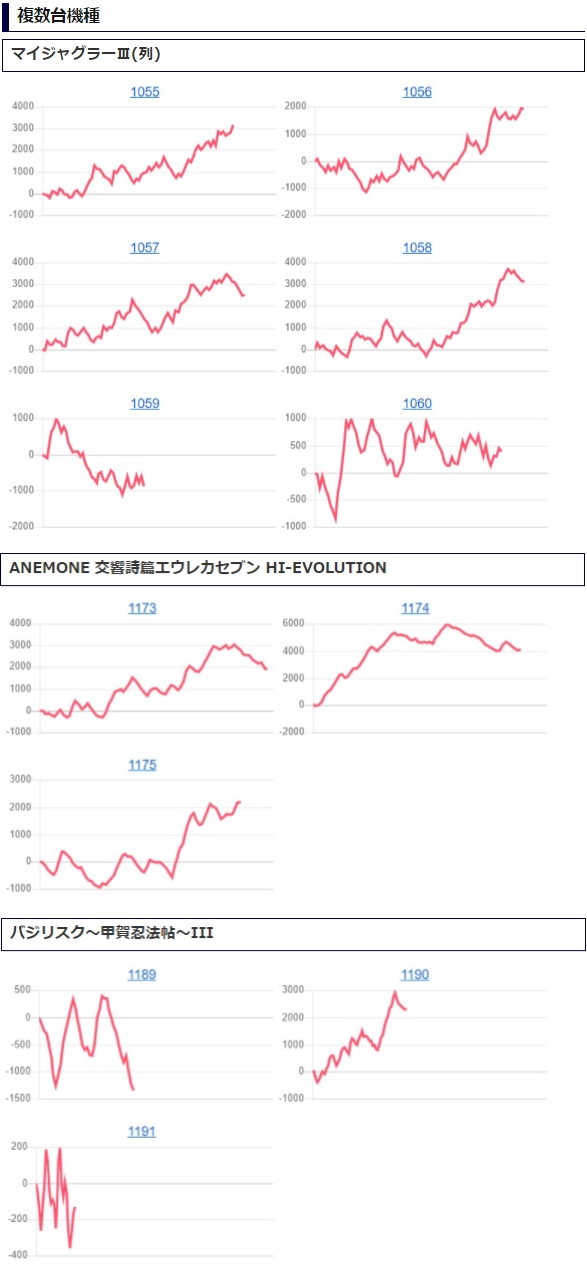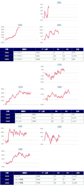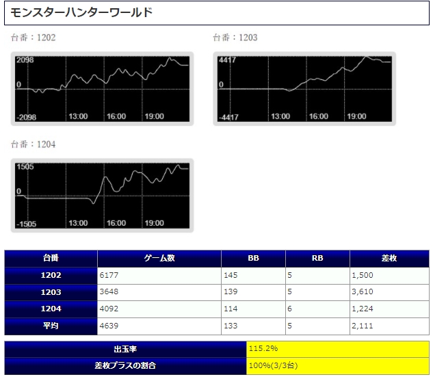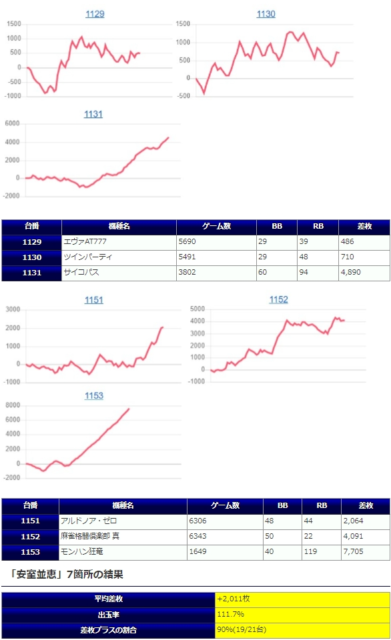 7箇所21台での用意で、「マイフラワー」で+4,674枚、「ドリハナ」で+3,075枚、「ドリハナ&鳳凰」の機種跨ぎでも+2,234枚、バラエティから2箇所「エヴァAT777・ツインPARTY・サイコパス」「アルドノア・麻雀真・モンハン狂竜」もモンハンの+7,705枚を筆頭に全台プラスと各所素晴らしい結果を魅せ、並び系全体で出率111.7%の勝率90%は出来過ぎですね