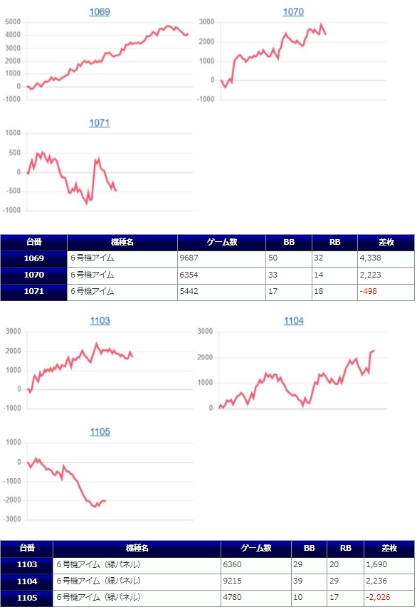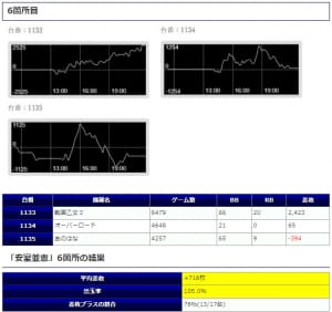 しかし、その分「番長3」で+7,298枚、「スーミラ」で+6,681枚、「バイオリベレ」で+6,452枚、「ガメラ」で+5,196枚他、本来の⑥のポテンシャルさえも凌駕する爆裂を魅せた台が非常に多く現れ、平均出率110.1%の文句ない出玉感を披露しています。