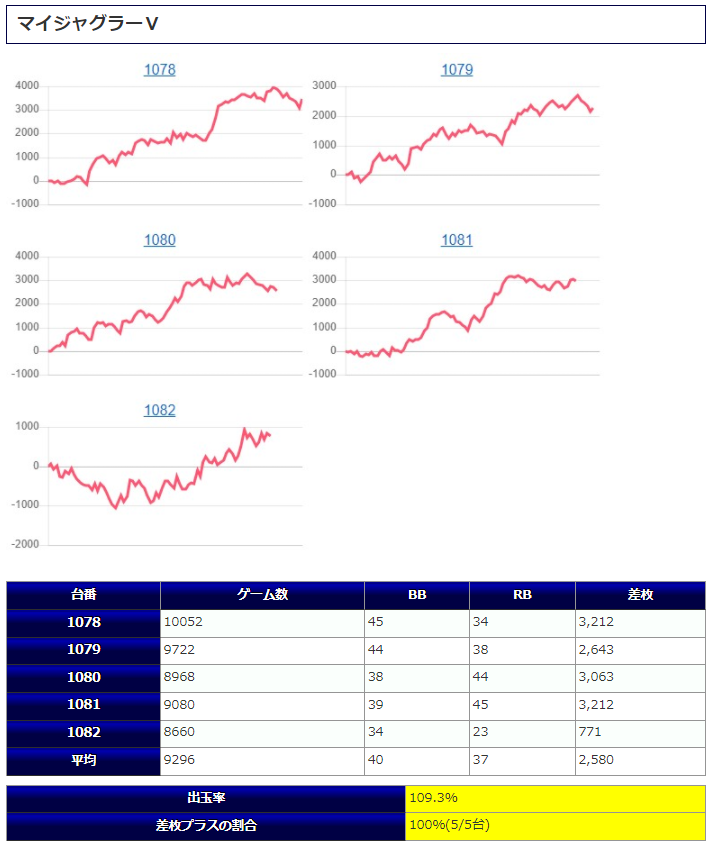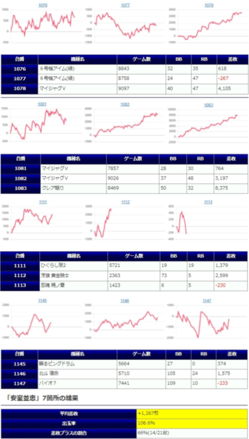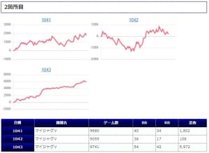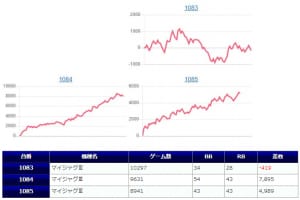並び系も沖スロ系が箇所単位で不発であったり、マイナス台も頻発してしまい、大きなマイナスはマイジャグⅢの一箇所だけで底堅い、中身の信頼度は高いと思えるものではありますが、出率106.6%の平均差枚+1267枚はクレア眠りやマイジャグVの好結果があった割に物足りなさもあり、勝率66%はいつもの安定感あるやらかしからみれば物足りない、決して良い数字とは言えないでしょう。☆3まで