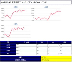 ANEMONEからも+4,080枚を筆頭に3台出揃う好結果を示していましたが、バジⅢでは+2,299枚と好差枚を付けた台も出ましたが2台はマイナスで単品様のポイントに。