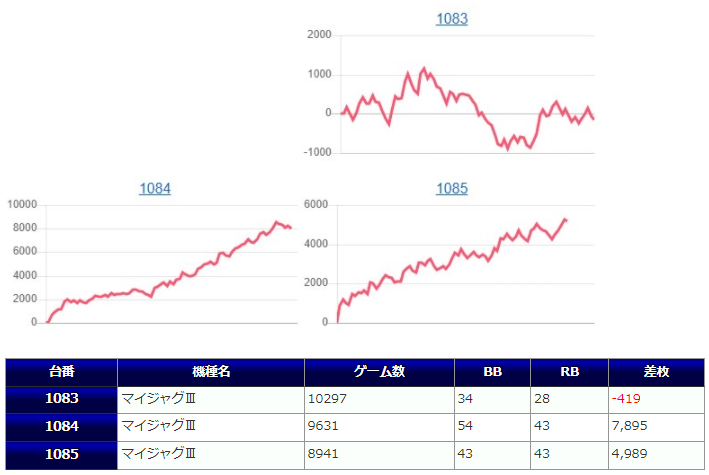 ジャグラー系で用意された4箇所からは最新台「マイジャグラーV」から+4,105&+ 3,197を出し、クレア眠りでは+8,375枚とマイジャグVと競うように綺麗な右肩上がりを描いていました。