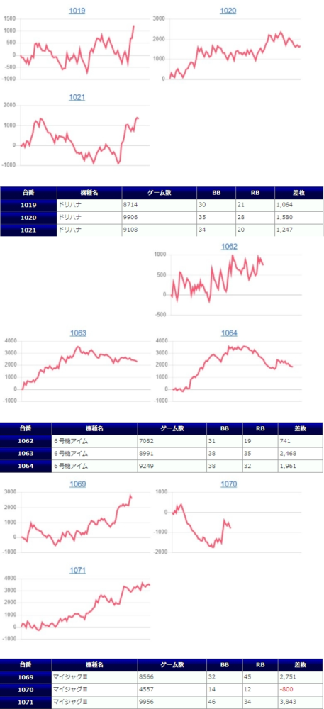 【全台系】では全⑥で6号機アイム(緑パネル)が5台全てプラスの平均差枚+1,961枚とド安定の満足の結果が伺える様子。まどマギ2からも+3,575枚