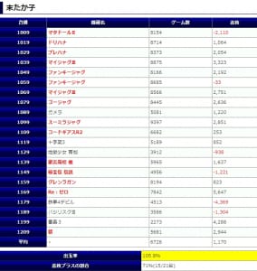 【末尾系】は平均出率102.0%の勝率50%(11/22台)と前回より大きく下がってしまい残念な結果です。末尾の配分はÁタイプとAT機が半分ずつでしっかりと中身が伴っていれば安定した出率が出たと伺えるので、今回はマイナス評価です。次回に期待します。