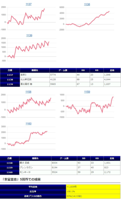 【並び系】については前回の倍の10箇所30台で平均差枚+1,856枚出率109.4%勝率73%ととんでもない数字を叩き出している。