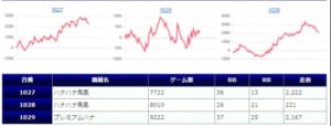 【末尾系】は前回不発のマイナス評価だったが、期待に答えてくれる凄い結果になりました。【マイフラワー】+6000枚【牙狼】+5,732枚【バイオリレべ】+4,778枚と末尾平均差枚+1,856枚、出率109.4%、勝率73%(22/30台)と当ホールが大丈夫なのか?と心配になるぐらい出している圧巻の出玉結果と伺えます。