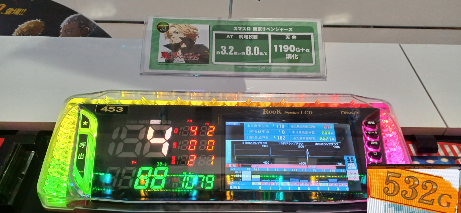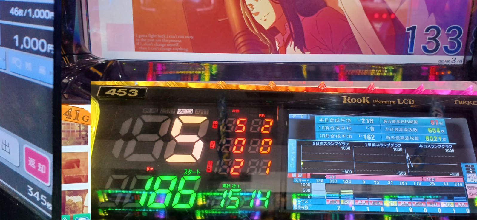 4パチ新台はリアルタイムで動いてる様子は無く、1パチ新台はらんま99甘が少し稼働していた、スロット新台は未確認