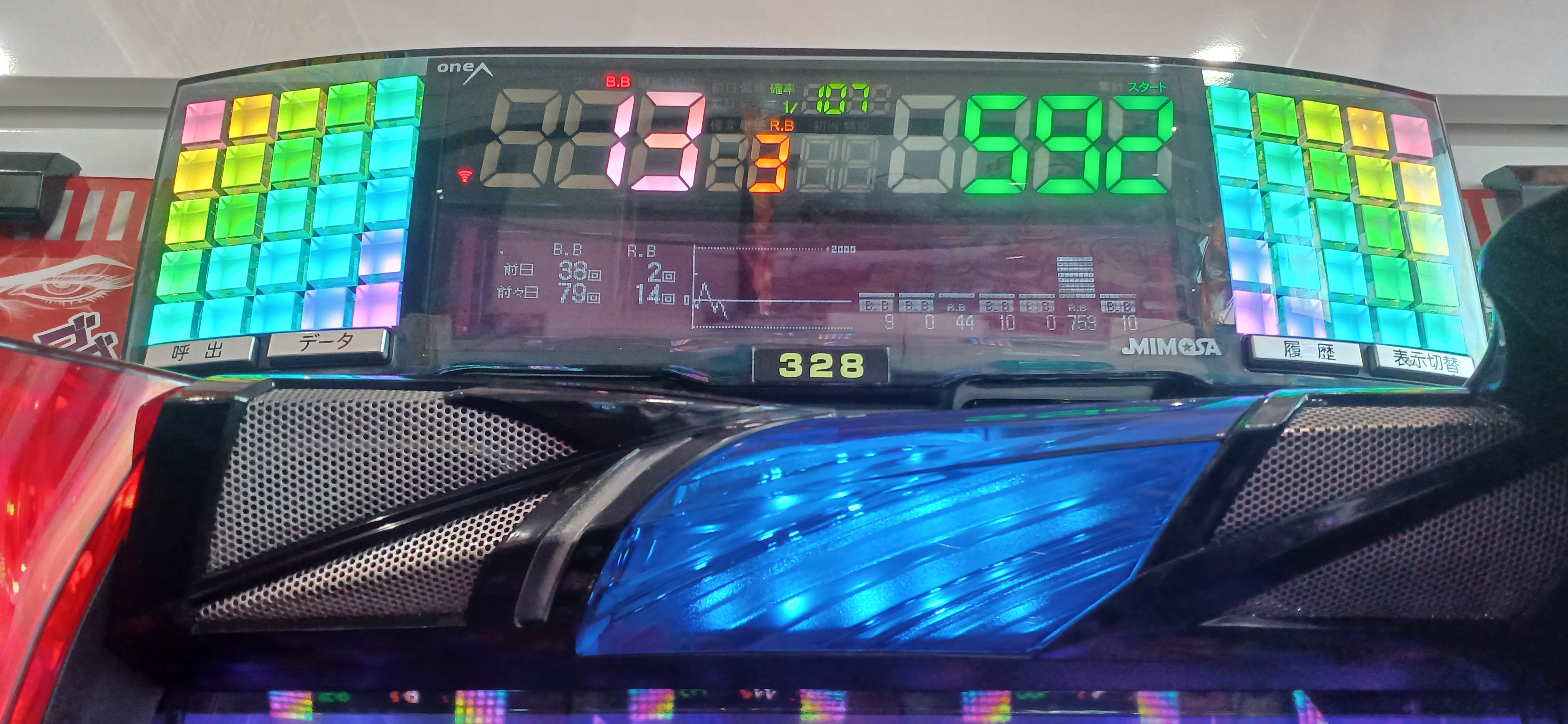 データ機器は変わらず中型7セグカラフルデジタルという感じで問題無し、台間シャッター有、肘掛け無し、Wi-Fiはパスワード不要で接続できるが、通信速度は遅めかつ、安全なWi-Fiではない表記が出るためあまりオススメはできない、USBは充電速度遅め、休憩所は特に変化無しだが、新たにパチパチ7のポスターが貼られてることを確認、食堂は無いので近くのモスバーガーやJoyfullで済ませるのが効率的、装飾の華やかさは特にあまり変化は無し、騒がしすぎず、華やかすぎず、でも少し控えめなシンプルさも感じた。
