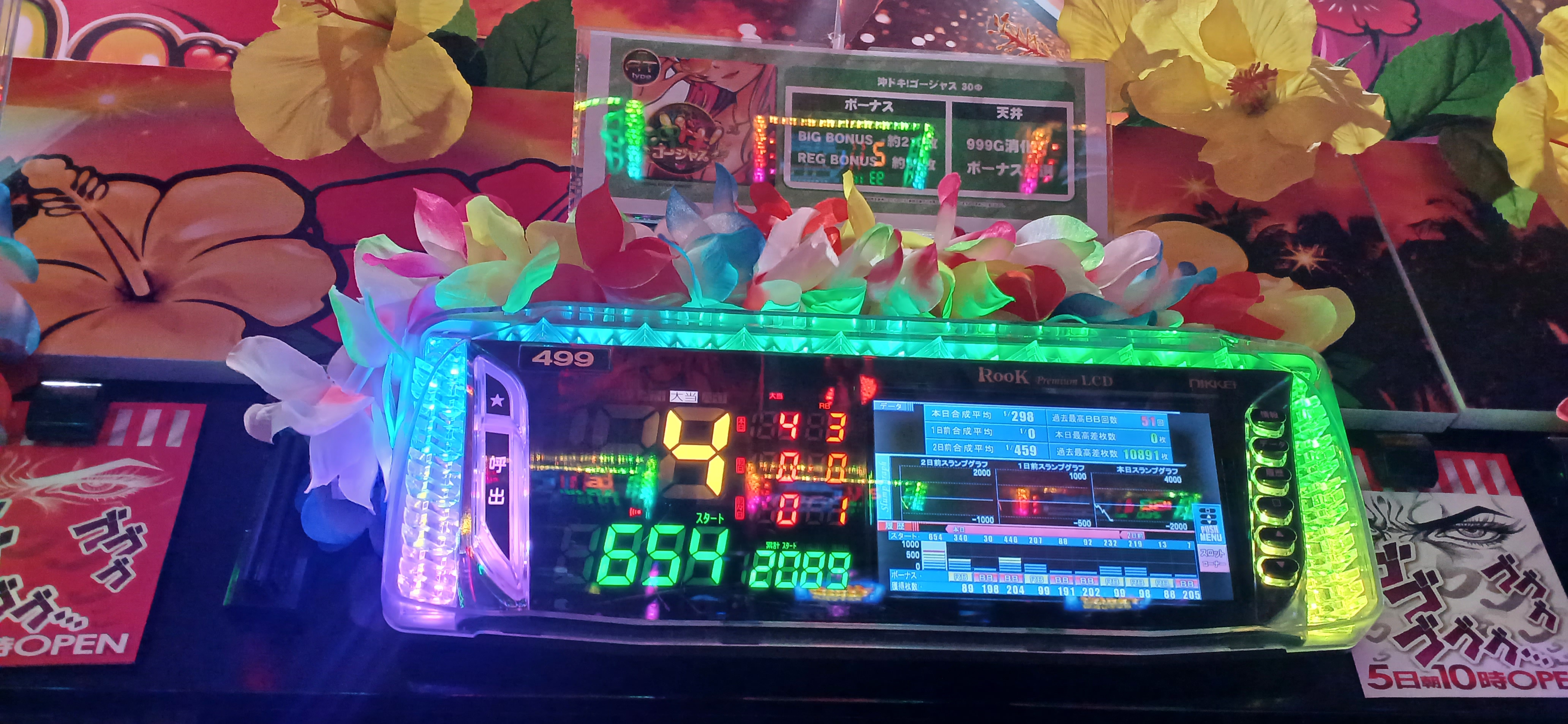 出玉記録は沖ドキゴージャスが2000枚、デビクラ5,ヴ2,グール,モンキー,秘宝伝が3000枚、からくりが8000枚を確認