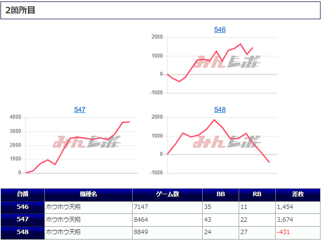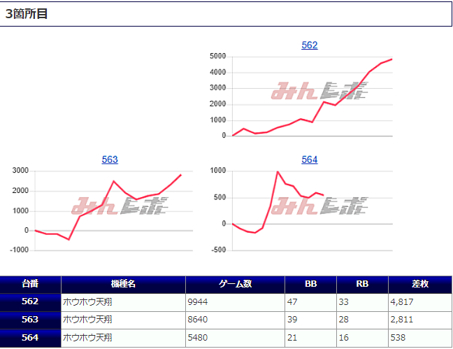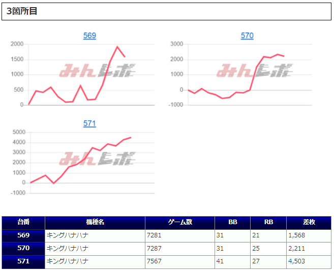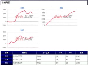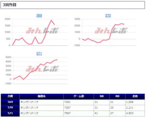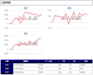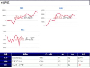 「ファンキージャグ」では万回転に迫るぶん回しがあり、かなり手ごたえを感じていたことが見て取れ、残る2台もそれに追随して深い打ち込みがあったことから、こちらも「並び」を意識した稼働ができていたようです。