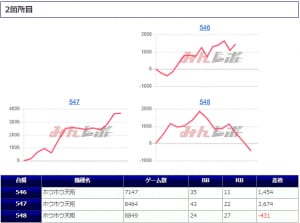 それぞれ終日近い打ち込みを見せており、539番台では大きなハマりもなく終日キレな右肩グラフを形成していったようです。