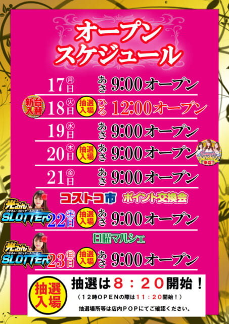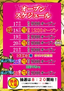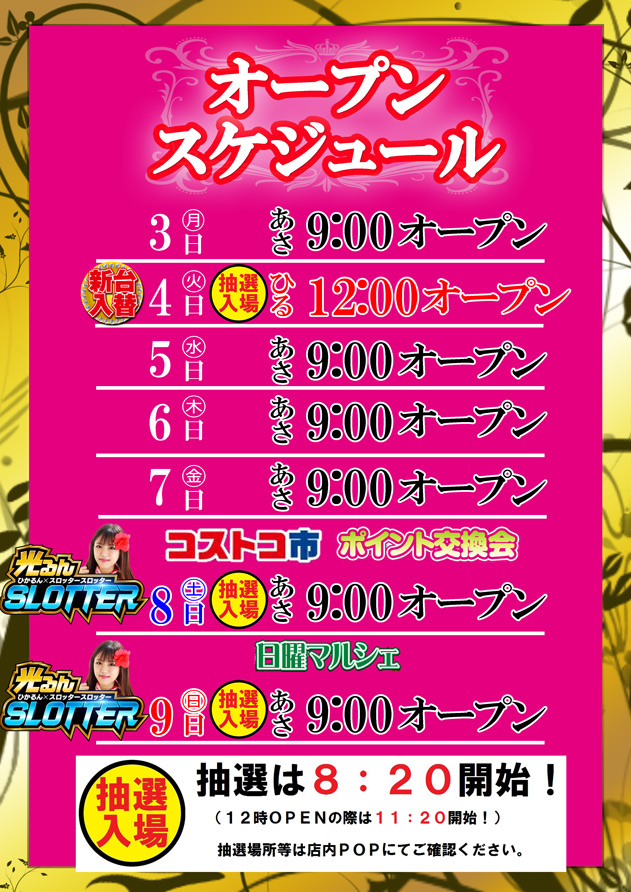 0の付く日に開催されている【スロッター×スロッター】では光り物をメインに仕掛けられていますが、今回は【光るん×スロッター】と同時開催ということでそれ以外の機種をメインに仕掛けてくると予想しています。