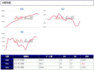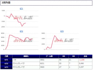 その他にも「アイジャグ」から+1,381枚などが見られ「光るん」同様大きくプラスで終了かと思われましたが、マイナス着地も同様に目立ってしまい平均差枚+448枚とこちらは大きく伸びることはありませんでした。
