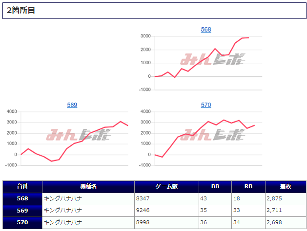 2か所目でも「キングハナハナ」が+2,875枚、+2,711枚&+2,698枚を披露。
