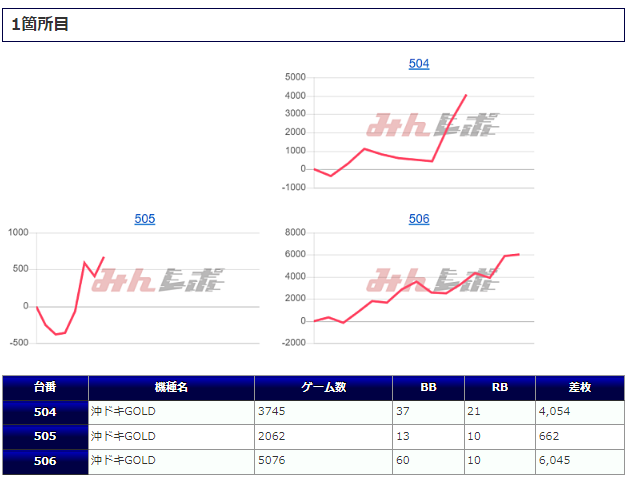 今回まず目に飛び込んできたのが「沖ドキGOLD」で+6,045枚、+4,054枚が炸裂。
